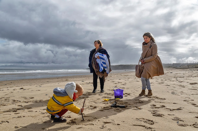 On a day like this, cool and threatening rain, it's not a lot of fun for the adults - unless they have a camera. So this scene, enacted in September of last year in South Shields, near Newcastle, is what you get. The two women, obviously cold and bored, are in attendance on the young Lord Louis who is doing...who knows? He's very focused, though, and very intent on his digging. And the grandfather? He's off up the beach somewhere taking pictures of clouds.